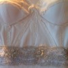 In pristine condition with absolutely NO damage to lace, sash or bustier. Been dry cleaned and looks like new. Packaged in original Casey Jeanne box with crochet needle for hooking covered buttons.