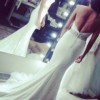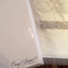 Off white, vintage inspired bustier with exposed seams. Crystal beaded sash. Beautiful vintage lace. Low back with covered buttons. Tailored with seamless fit. Hollywood train.