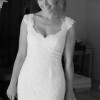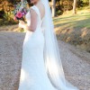 This is a custom made dress by European designer Anna Schimmel. This cap sleeve wedding dress highlights modern simplicity with its softly sculptured, graceful design. A silk satin sheath overlaid with French corded lace. V neckline softened with scalloped detailing. A mid back and rich lace train complete this charming wedding dress.