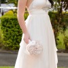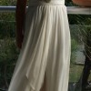 This dress design is 'Elizabeth' and is designed by Anna Campbell. It is made of 100% silk and silk chiffon. The top is a medium size and the bottom is a small size grecian style skirt so it is fitted around the waist and the skirt flows beautifully from the waist down. . it has beautiful embellishments, one in the front under the bust and the other over the back of the shoulder and down the middle of the back. The waistband is elasticated so it is flexible for sizes between small to medium and has silk chiffon that wraps around the waist and ties at the back. I also purchased an extra piece of silk that can be wrapped around the waist and tied at the back which is how i wore it on my wedding day. I am heart broken to part with this dress, however it is so beautiful and i would rather it be worn again than sit in my wardrobe for the next 20 years!