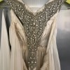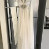 This dress was altered by a tailor recommended by the retailer. Extra silk was purchased from the designer and used to add extra gathering around the bust line to accomodate a larger bust size (fits D cup). It can be worn with a specialised bra or without (i am a Dcup and a bra was not needed). it was hemmed for a hight of 163cm (was worn with high heels and also flats later on in the night). Despite being dry cleaned there are a few very faint marks on the train at the back of the dress right down the bottom. However the flowing nature of the skirt makes them very hard to see. When being worn i don't think they would be noticed at all. I only saw them on very close inspection of the chiffon however i wouldn't feel right if i didn't mention them. There is also a mark on the silk belt however this can be worn on the opposite side and it would not be seen.