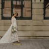A satin, strapless mini dress underneath a delicate, full-length, embellished and lace sheath. Off the shoulder, with fitted lace sleeves, scalloped edging and a lovely train. I met the seamstress who made the amazing lace sheath and she said it took her 70 hours..! It really is stunning and can still be viewed on Anna Schimmel's website but I understand she no longer makes this style.