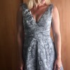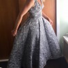 The stunning sculptural fabric makes this dress a stand out. Shades of grey and silver, the weight and drape give the feeling of glamour and class... Not for those who want to look just just the same as the next bride!! A beautiful plunging V-neck give the bust the right type of perk (I am a B cup in the photos), but not so much that you'll feel as though you are promoting the wrong image on your wedding day! The roses across the shoulder are handmade and the sash can be worn in a number of ways (bow to the front, back, side or no bow at all). There is a subtle hint of a train though it is easy to manoeuvre and very comfortable. I am 180cm tall so if you are any smaller you would be able to hem it to have more of a train (or none at all... so many options!) I am selling this dress brand new as I had a change of plans and ended up getting married in the middle of winter so bought a long sleeve dress better for the conditions. It is beautifully made by an amazingly talented New Zealand designer who really does care about the brides she dresses. Tags are still on and it comes in perfect condition with the original box (the box has a small tear on the corner from when it was shipped to me). If you would like any more information please ask.