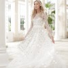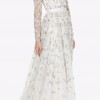 The Astral Gown features a delicate trailing floral motif in silver-cut beads and sequins, that catch the light beautifully for an overall shimmering effect. The artwork begins at the bodice and floating petal motifs scatter towards the hem, creating a flattering fairytale silhouette. The fitted bodice is finished with a grosgrain trim at the waist, and the full voluminous skirt is formed of layered tulle with a net underskirt. Slim, sheer embellished sleeves complete this stunning bridal gown.