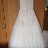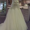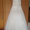 The bodice comprises two layers of lace fabric with very delicate beading, a satin layer underneath, and a boned lining to keep a perfect shape. The lace is beautifully soft, enhanced by clear, pearl, cream and silver beading - just enough to catch the light and sparkle without detracting from the intricate lace detail. The ivory satin bow around the waist is detachable.