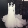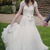A full tulle skirt hangs from the upper thigh creating a distinctive wedding gown with great movement of fabric and a train. The tulle is embroidered sparingly with bead and lace motifs to bring the material and design of the dress together. The skirt comprises a delightfully soft and full tulle layer, over two layers of netting to provide volume, a layer of lace, then satin and finally a satin lining. The tulle train can be gathered to hang on a finger if required when dancing.