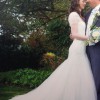 Purchased new as a size 10, I had the bust taken in to make it a size 8-10 (32" bust, 24.5" waist, 39" hip). The length will suit 5ft 8" with flat shoes, to be just off the floor, or shorter ladies with high heels. I had a detachable matching tulle shrug made to cover my shoulders/back, which is included.
