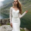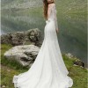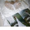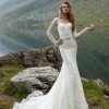 Delicate and elegant Chantilly lace complementing all curves of your body! Long sleeves, Illusion lace around neckline and V-shaped illusion lace back. Lace overlay on top of a satin dress with firm boned sweetheart corset. Chapel length train gives a royal look to your unforgettable image. Beaded Sash included.