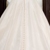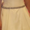 Bust- 32.5 inches- Waist- 27.5 inches- Hip (fullest part)- 40.5 inches. BELT SHOWN NOT INCLUDED. Buttons were added to the back of the dress all the way to the bottom of the train. I am 5 ft 4 and wore this dress with shoes with 2 inch heels. The dress has been professionally dry cleaned since it was worn. Dress bustles beautifully in the back to match pattern in the front. Bustier that discreetly snaps onto the inside of dress (to hold into place) included. Dress is A-Line ball gown with a little extra crinoline sewn in for volume! Dress has pockets! Hemmed with horsehair