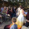 A line dress from maggie sottero line. Chapel train that busters up with 3 buttons. It was custom airbrushed to for our sunset themed wedding. I am 5'9" and it hits the floor perfectly for me to wear flats.