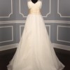 This Anne Barge Emmanuelle wedding dress is Brand New with its hang tag attached! The honey color cummerbund-like detail around the waist is gorgeous! This gown is made from a combination of incredible fabrics.