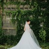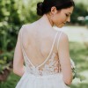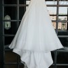 CUSTOMIZATIONS: Added an additional 12 inches on to the back of the train, changing it from chapel to cathedral length train. Ordered without the ribbon and lace details on the bottom (as seen on model) to make me look taller. Nude cups are sewn into front so that lace is not see-through. You couldn't see cups in dress while dress was on (see pictures).