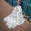 The high waist ruffled skirt is worn over a separate underskirt to give it volume, and allows comfort and room to move. The skirt's long train adds elegance to your walk down the aisle and can be pinned up through a hoop that easily attaches to the back when dancing.