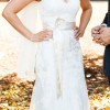 Lace and tulle wedding dress with V-neckline and cap-sleeves features a separate slip gown of Vogue Satin to be worn below. The keyhole open back is finished with a covered button over zipper closure. Includes a detachable champagne sat ribbon belt as shown in pictures.