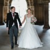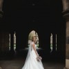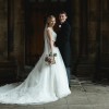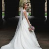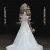 Fitted bodice with glimmering lace appliqués, dotted with Swarovski crystal and pearl embellishments, featuring stunning illusion sweetheart neckline and illusion back. The chapel length train is trimmed in lace. Dainty lace cap-sleeves and a delicate ribbon belt at the waist complete the look, with the latter matching the trim of the chapel length veil. Finished with covered buttons over zipper and inner elastic closure.